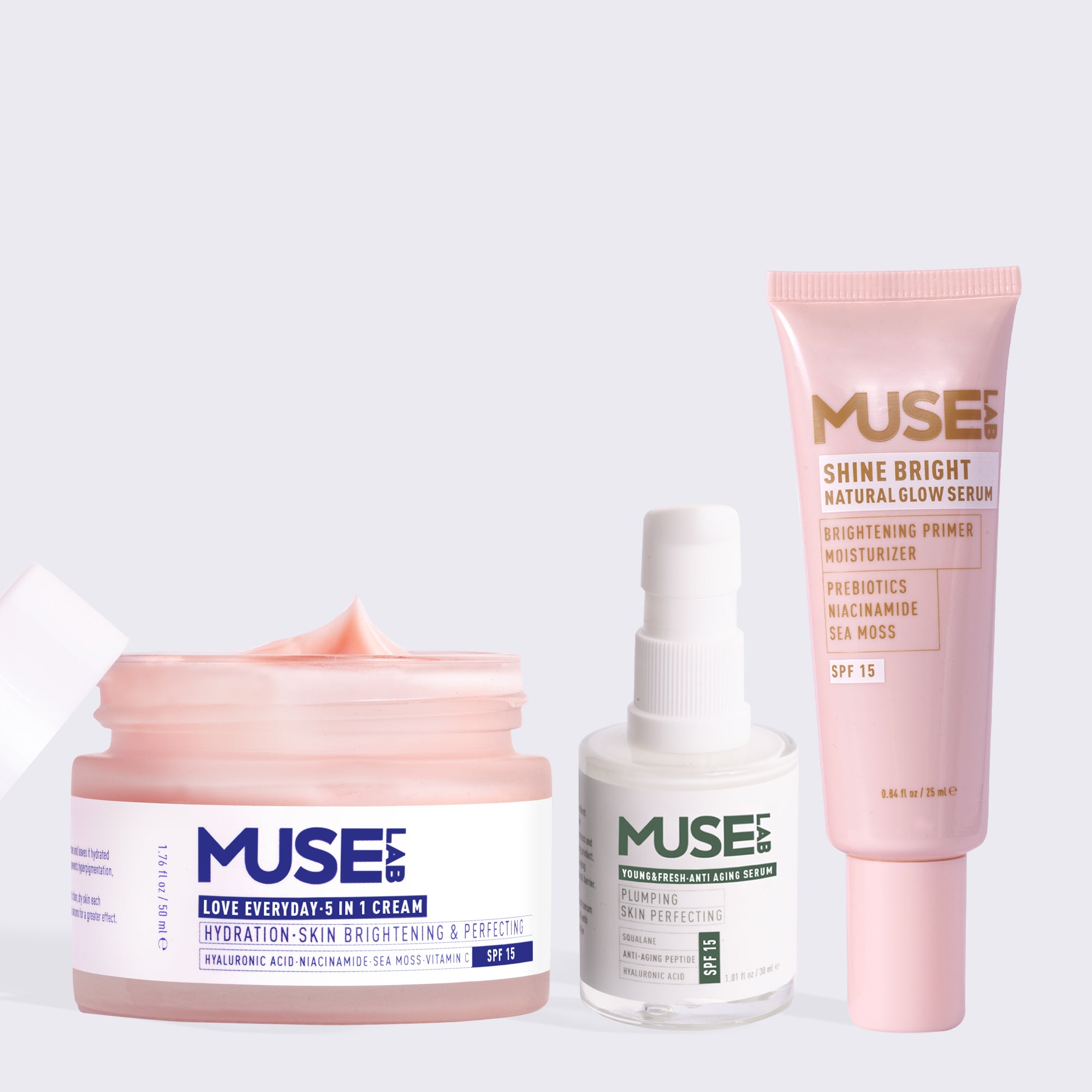Muse Lab, cilt yaşlanmasını yavaşlatmaya, leke oluşumunu önlemeye ve güneşin zararlı ışınlarına karşı koruma sağlamaya yardımcı olur. Günlük bakımınızı kolaylaştıran tüm ürünlerimiz SPF 15 içerir.